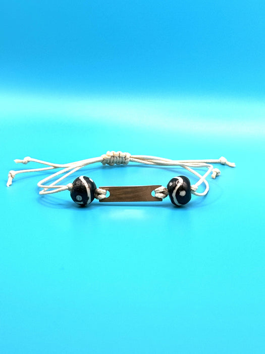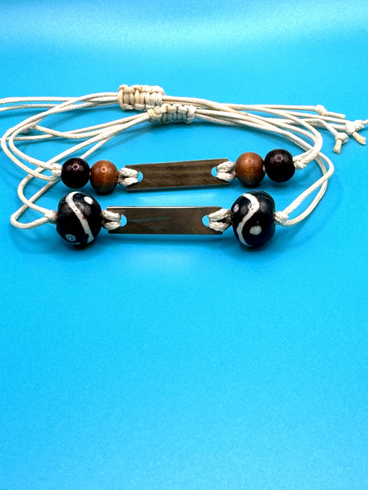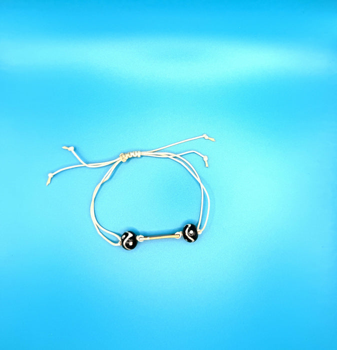Adjustable friendship bracelet on cream colored cord with dark brown beads and upcycled cymbals