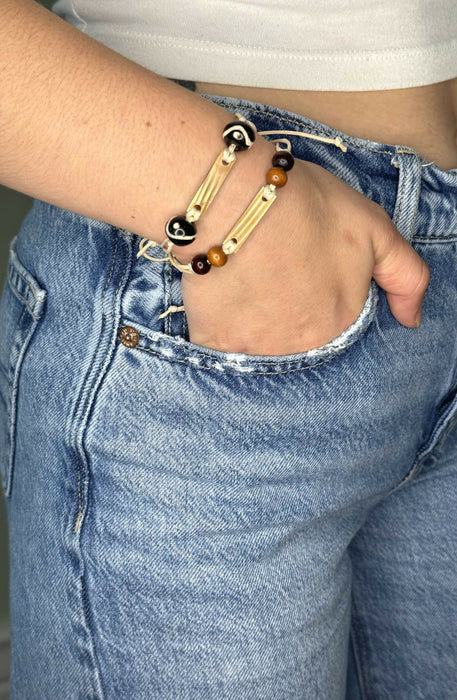 Dark brown wooden beads are a great accent this cool bracelet.