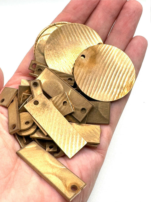 Pendants at either end are machine pressed from a retired ZILDJIAN crash cymbal. Circle pendant measures 1/2 inch in diameter and rectangle pendant measures 1 1/2 inches by 1/2 inch.