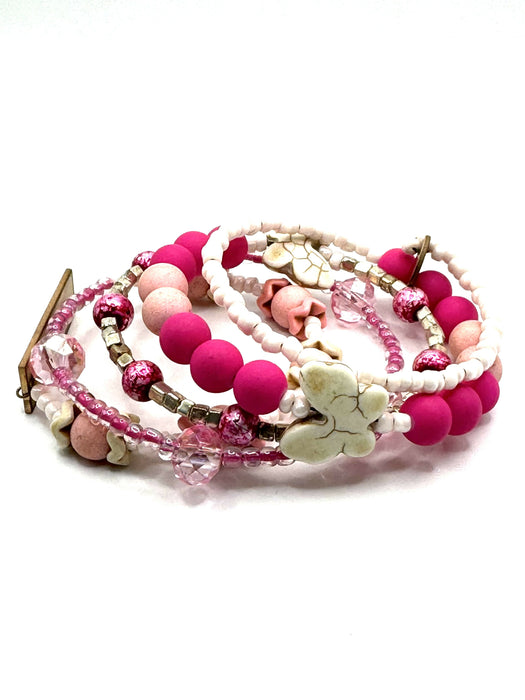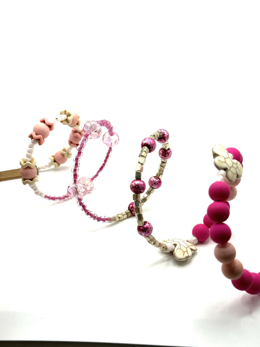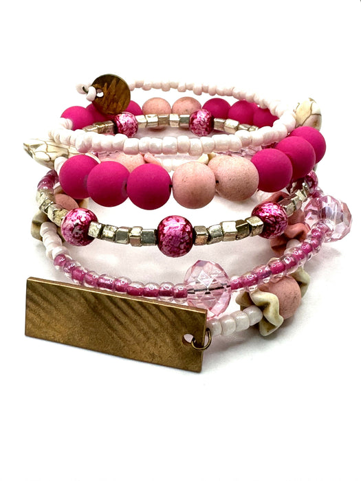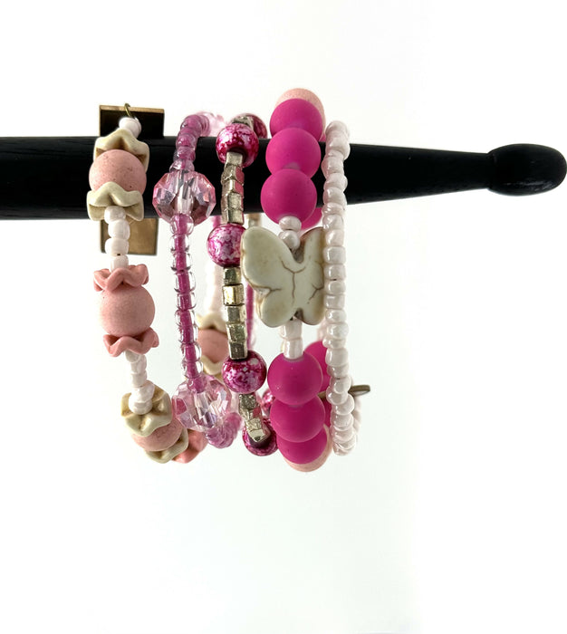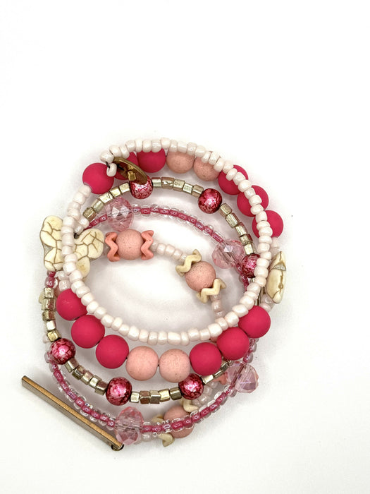 This fantastic memory wire bracelet in shades of the pink looks like individual bangles! One size fits all AND bracelet wraps around your wrist…so NO clasp!