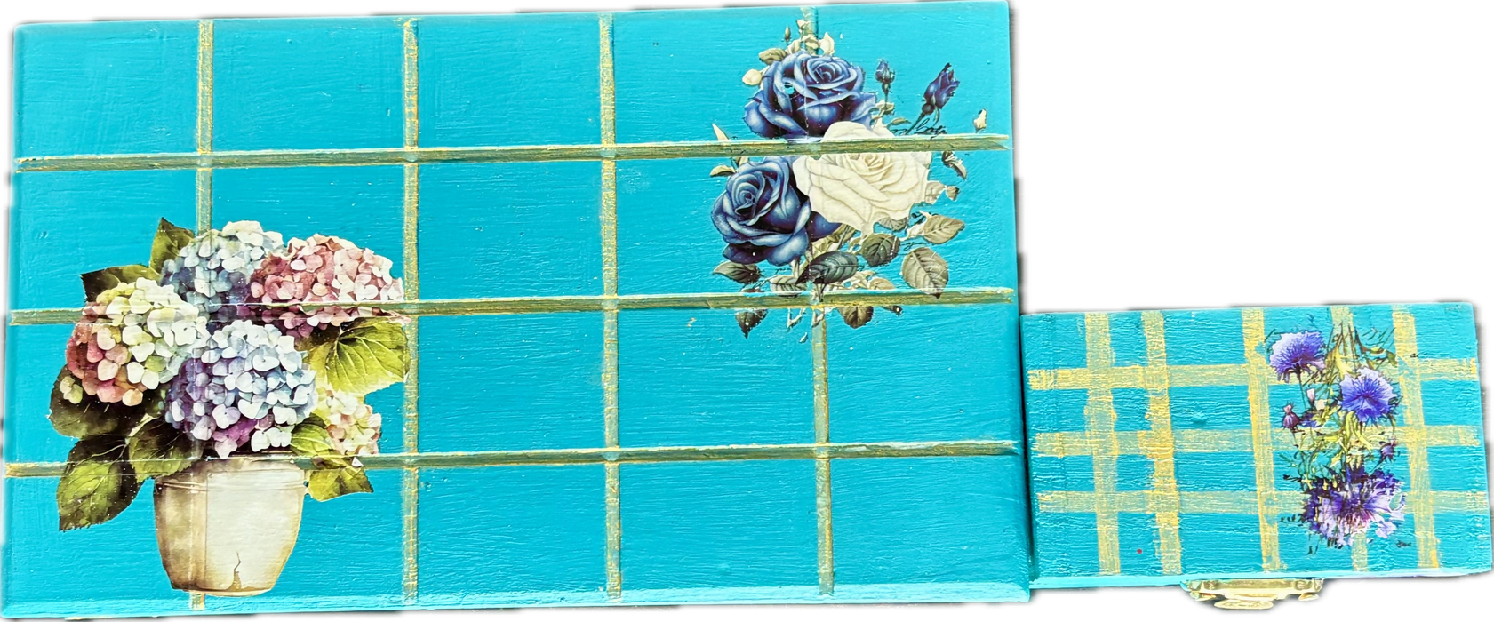 Add a touch of charm to your dresser or nightstand with this beautifully upcycled vintage wooden jewelry box, lovingly revived with a fresh coat of bright blue chalk paint and accented with delicate gold detailing and floral transfers. The cottage core aesthetic brings whimsy and warmth, making this a delightful piece for any jewelry lover.