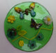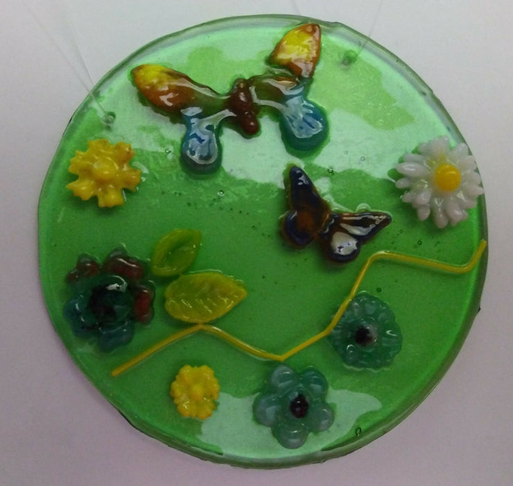 GLASS CIRCLE WITH FLOWERS AND BUTTERFLIES. LIGHT GREEN BACKGROUND