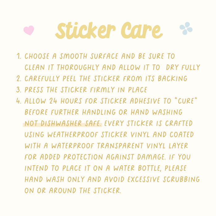 Sticker is printed on premium weatherproof sticker vinyl and has a layer of waterproof transparent vinyl on top for added protection from scratching, rain & sunlight so you can literally put it anywhere!
