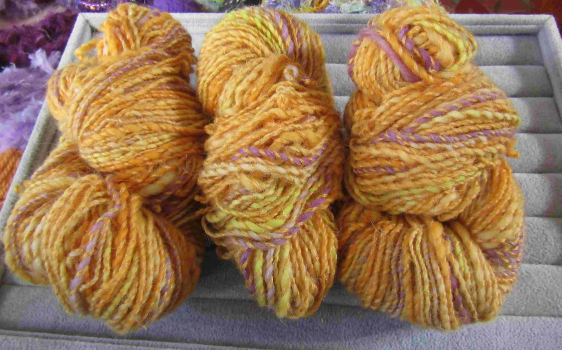 3 skeins of dk weight wool handspun, total of 230 yards. Hints of lilac and light green but mainly orangey gold. Spun by me on my Ashford traditional wheel. Great hand, would make a nice child's sweater, small shawl, scarf, or ??