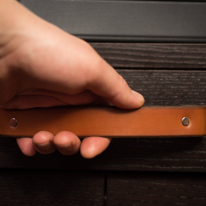 The Tilikum is a traditional all-leather handle large enough to be a statement piece, vertically or horizontally. It has two points of contact for a strong anchor.