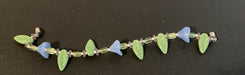 Wear a miniature garden on your wrist with this adorable beaded bracelet! This bracelet features glass beads in floral shapes -- opaque green leaves, translucent blue bell flowers, and translucent pale purple flat flowers -- spaced out with transparent green rectangular tube beads and opaque white seed beads. Bracelet is 7 inches long and fastens with a silver-colored barrel clasp.