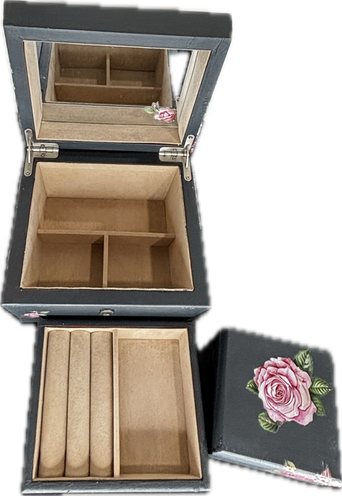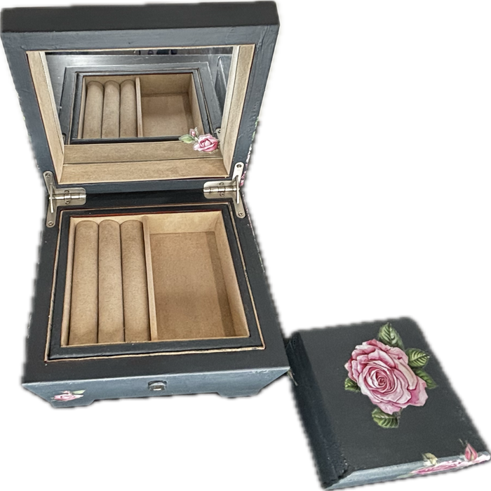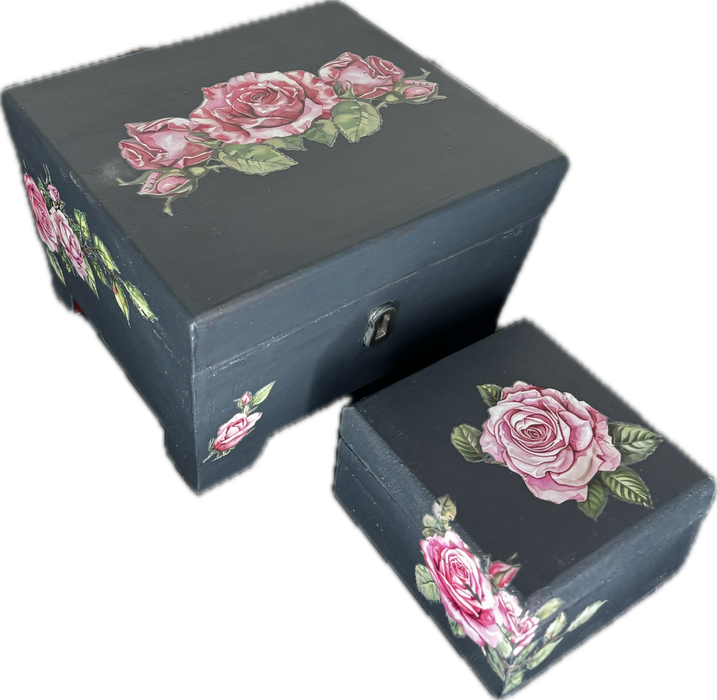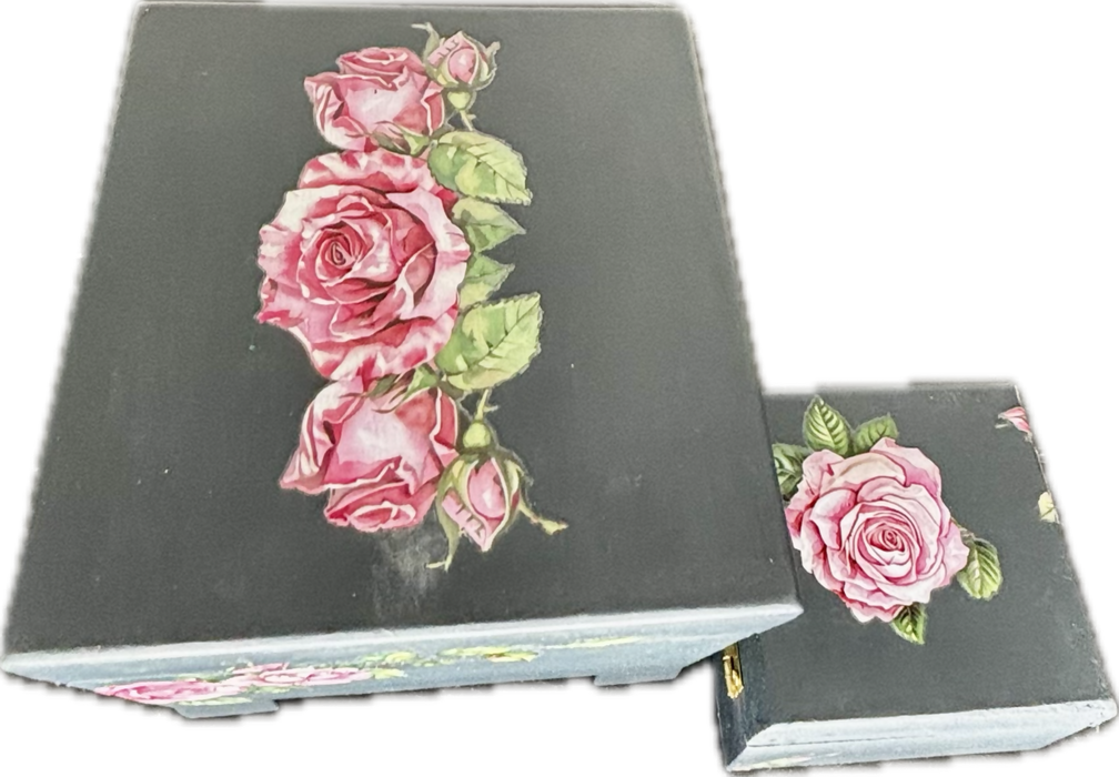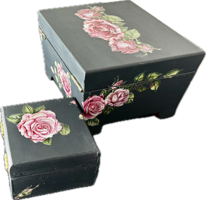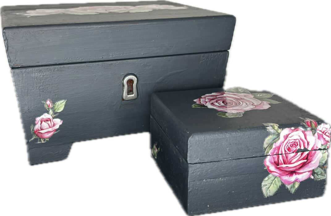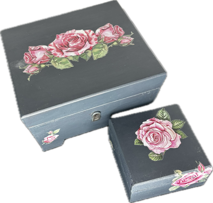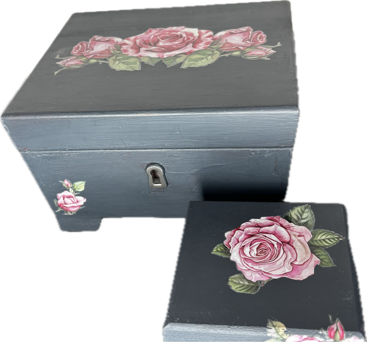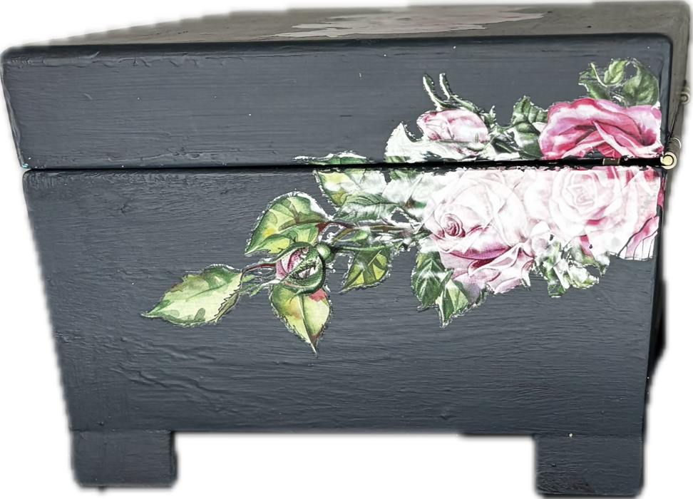 This charming small jewelry box has been chalk painted in a rich charcoal gray, giving it a timeless elegance. To enhance its beauty, gorgeous pink rose transfers add a touch of romance and shine. The entire piece has been waxed for durability, ensuring it remains a cherished keepsake for years to come.