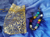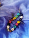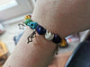 Colourful skull beads and jumping skeletons make up this elastic bracelet. Also one wood bead, one freshwater pearl, and one evil eye bead for some grounding and protection.
