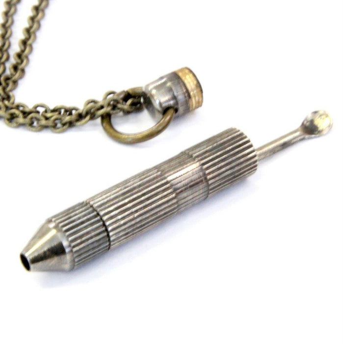 This solid brass snuff spoon measures 2-1/4" long when assembled and 1-3/8" long with the tiny spoon discreetly concealed inside the fluted pendant/ handle when worn as a necklace. The entire piece is made of solid brass with a hand burnished antique finish giving it a vintage appeal. This is not an urn.