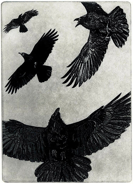 This is a hand-printed intaglio print of one of my favorite creatures. Throughout history, the Raven has been either seen as a God or the Devil. The truth is they are the most intelligent birds on the planet. Ravens are also the most playful bird species. They slide down snowbanks, apparently for the fun of it. They even engage in games with other species, such as playing catch-me-if-you-can with wolves and dogs. Ravens are known for spectacular acrobatic displays (Dances), such as flying in loops or interlocking talons with each other in flight.