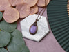 This wire-wrapped pendant features a mesmerizing piece of purple-hued purpurite, skillfully crafted into a unique design. Purpurite, known for its stunning violet tones, is a manganese phosphate mineral renowned for its metaphysical properties. This crystal is believed to enhance spiritual insight, promote clarity of thought, and stimulate intuition. The wire wrapping technique not only adds an artistic flair to the pendant but also ensures that the purpurite is securely nestled, allowing its energy to be harnessed optimally. With its rich color and reputed spiritual benefits, this purpurite pendant is not just a stylish accessory but also a meaningful adornment for those seeking a connection to higher consciousness.